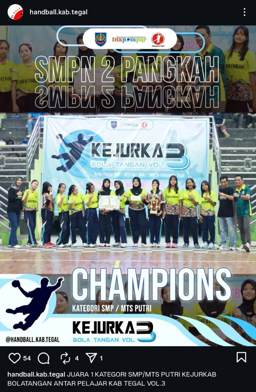 SMP Negeri 2 Pangkah kembali mengukir prestasi gemilang di tingkat Kabupaten Tegal. Di bawah bimbingan Bapak Tri Bagus Avianto, S.Or., Guru Olahraga SMP Negeri 2 Pangkah,Tim Handball Putri sekolah kita berhasil meraih Juara 1 dalam Kejuaraan Kabupaten (Kejurkab) Bola Tangan Antar Pelajar Kab. Tegal Volume 3 tahun 2025. Kejuaraan yang diselenggarakan oleh Dinas Pemuda, Olahraga dan Pariwisata (Disporapar) Kabupaten Tegal ini berlangsung meriah, dengan babak final dilaksanakan pada hari Sabtu, 2 November 2025.
